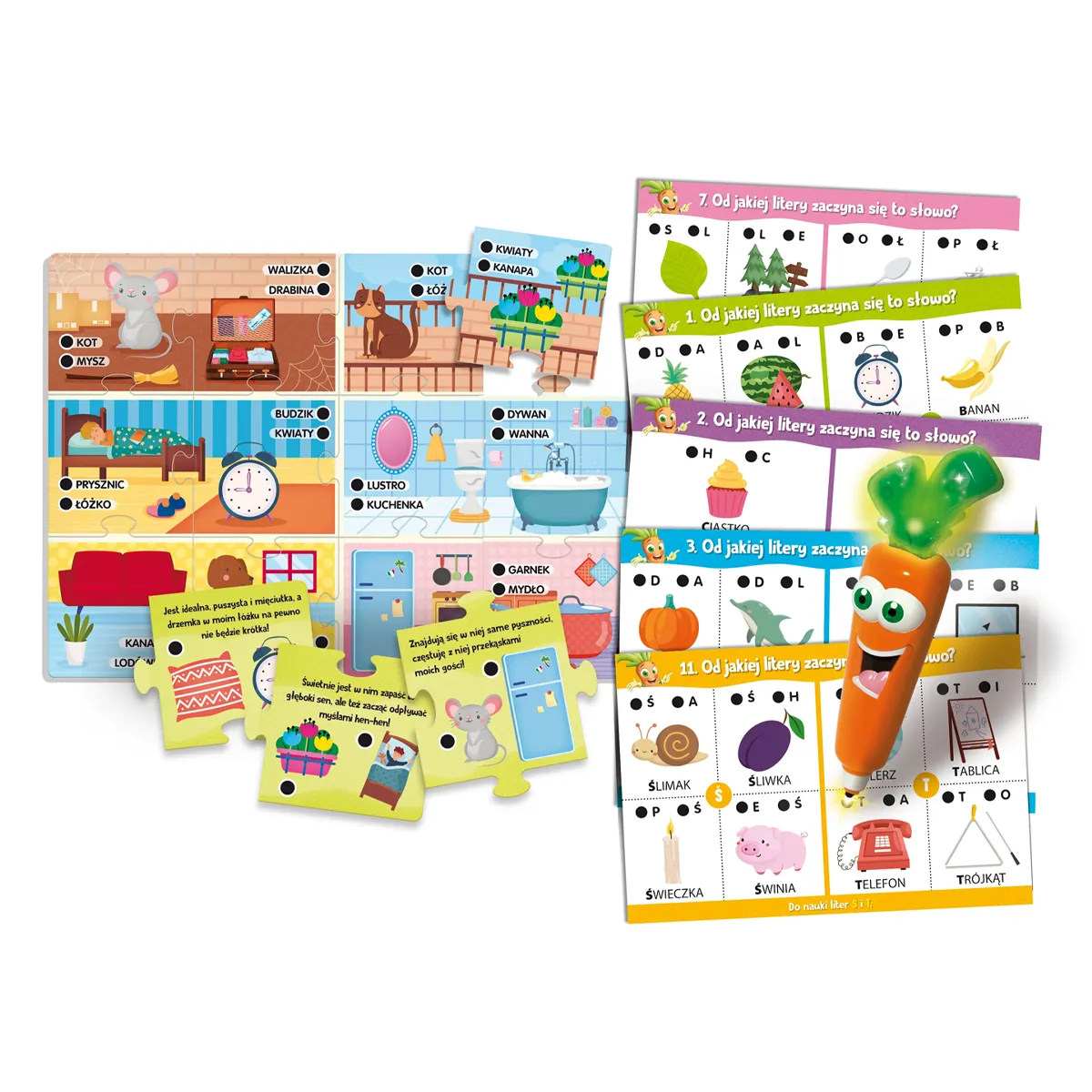 Zestaw wielu interaktywnych kart do nauki alfabetu oraz odkrywania prostych słów w towarzystwie mówiącej i świecącej Carotiny! Dodatkowo w opakowaniu znajdują się również puzzle przedstawiające domek z wesołymi zagadkami.